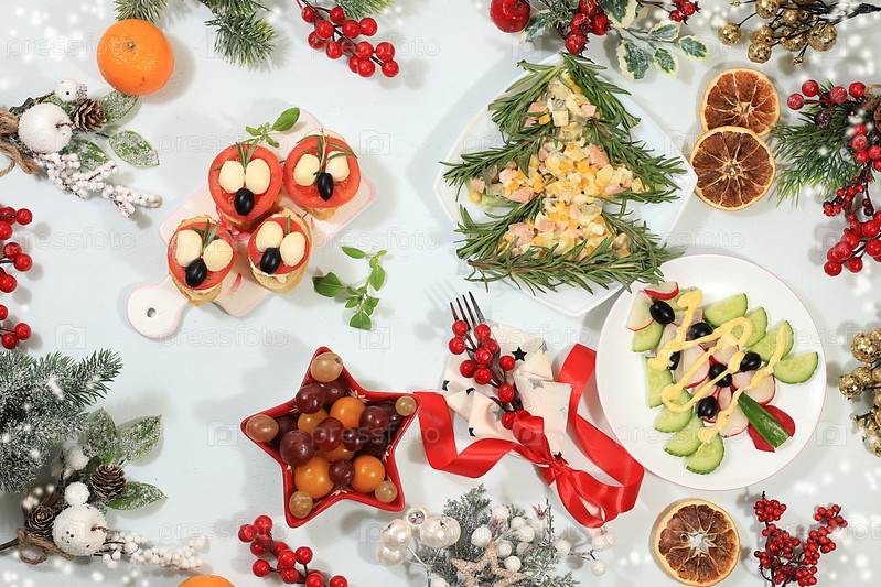 Рождественские новогодние блюда, традиционный праздничный салат с сыром, оливками, помидорами и виноградом, еловыми ветвями и украшениями, идея дизайна еды, выборочный фокус