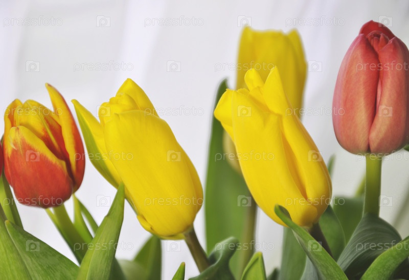 Желтые и красные тюльпаны на белом фоне