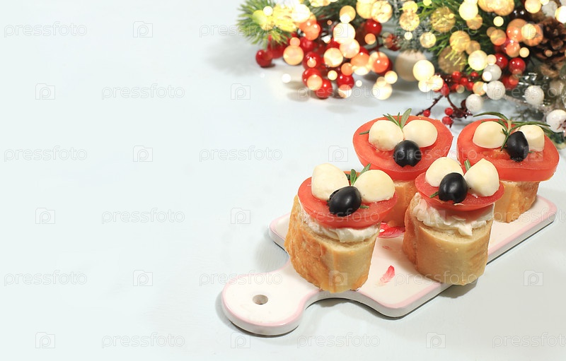 Рождественские и новогодние блюда, набор закусок и освежающих напитков для праздничного стола. Тарелка с канапе из помидоров, сыра моцарелла, оливок, черных оливок и винограда на темном столе, выборочный фокус