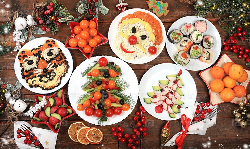 Рождественские новогодние блюда, традиционный праздничный салат с сыром, оливками, помидорами и виноградом, еловыми ветвями и украшениями, идея дизайна еды, избирательный фокус