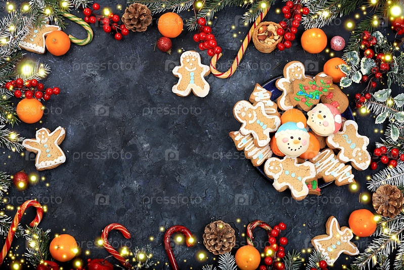 Рождественский новогодний фон, традиционные праздничные пряники и мандарины с еловыми ветками, шишками и украшениями, идея дизайна блюда, концепция выпечки,