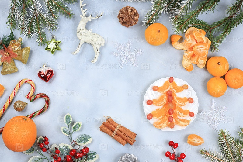 Рождественские новогодние блюда, традиционный праздничный салат с сыром, оливками, помидорами и виноградом, еловыми ветвями и украшениями, идея дизайна еды, избирательный фокус