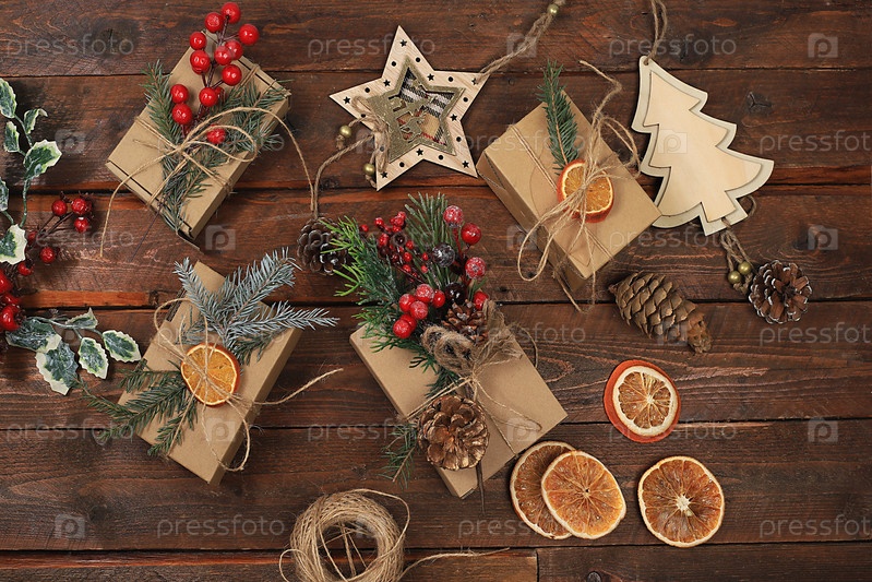 Деревенский стол с живой елкой, самодельными подарочными коробками и украшениями. Рождественский и новогодний макет для дизайна и демонстрации продукции, концепция нулевых отходов и покупок, выборочный фокус