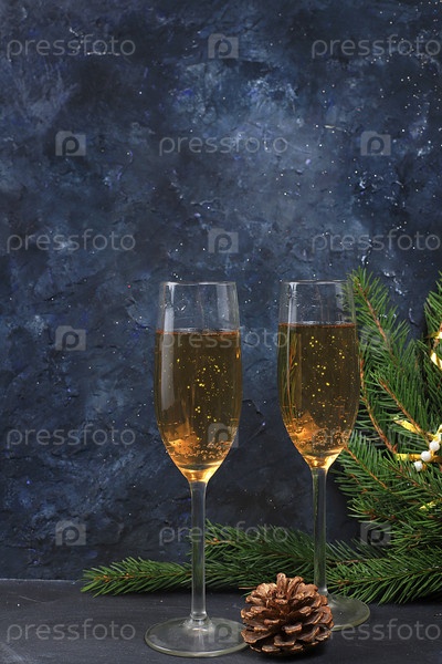 Рождественский и новогодний фон с шампанским, с венком из еловых веток, украшенный праздничными украшениями, место для текста. Праздничная открытка, баннер на экране, настройка продукта для праздничной рекламы, выборочный фокус,