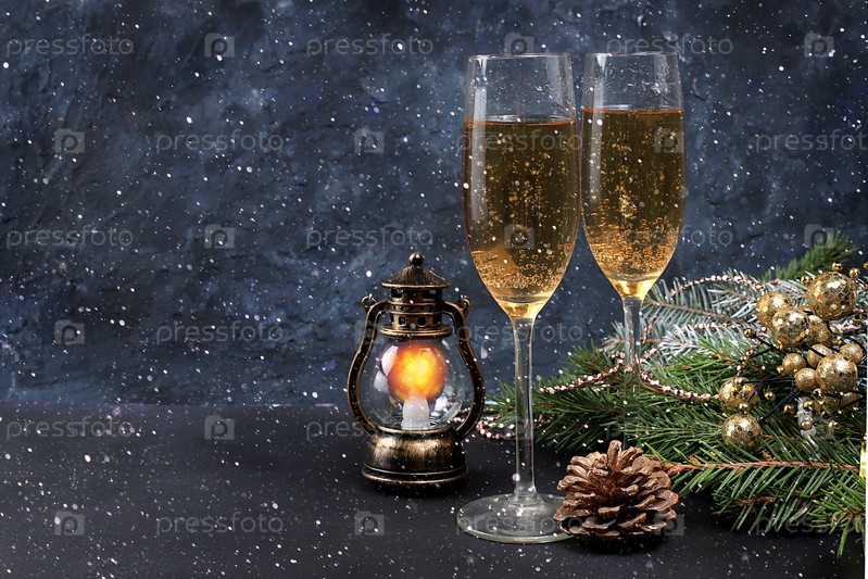 Рождественский и новогодний фон с шампанским, с венком из еловых веток, украшенный праздничными украшениями, место для текста. Праздничная открытка, баннер на экране, настройка продукта для праздничной рекламы, выборочный фокус,