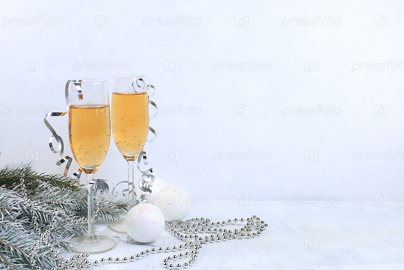 Рождественский и новогодний фон с шампанским, с венком из еловых веток, украшенный праздничными украшениями, место для текста. Праздничная открытка, баннер на экране, настройка продукта для праздничной рекламы, выборочный фокус,