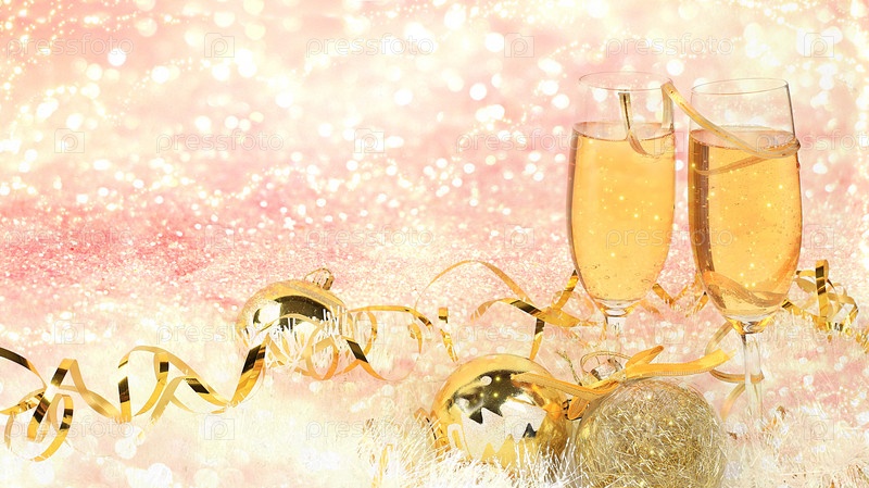 Рождественский и новогодний фон с шампанским, с венком из еловых веток, украшенный праздничными украшениями, место для текста. Праздничная открытка, баннер на экране, настройка продукта для праздничной рекламы, выборочный фокус,