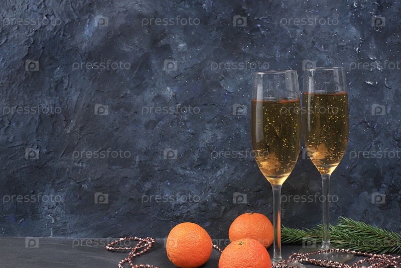 Рождественский и новогодний фон с шампанским, с венком из еловых веток, украшенный праздничными украшениями, место для текста. Праздничная открытка, баннер на экране, настройка продукта для праздничной рекламы, выборочный фокус,