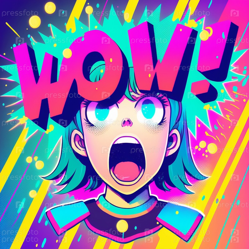 Мультипликационный знак разрыва облаков с миром WOW в стиле аниме
