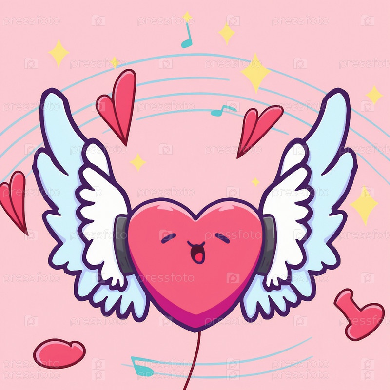 Мультяшный графический рисунок поющего сердца с крыльями
