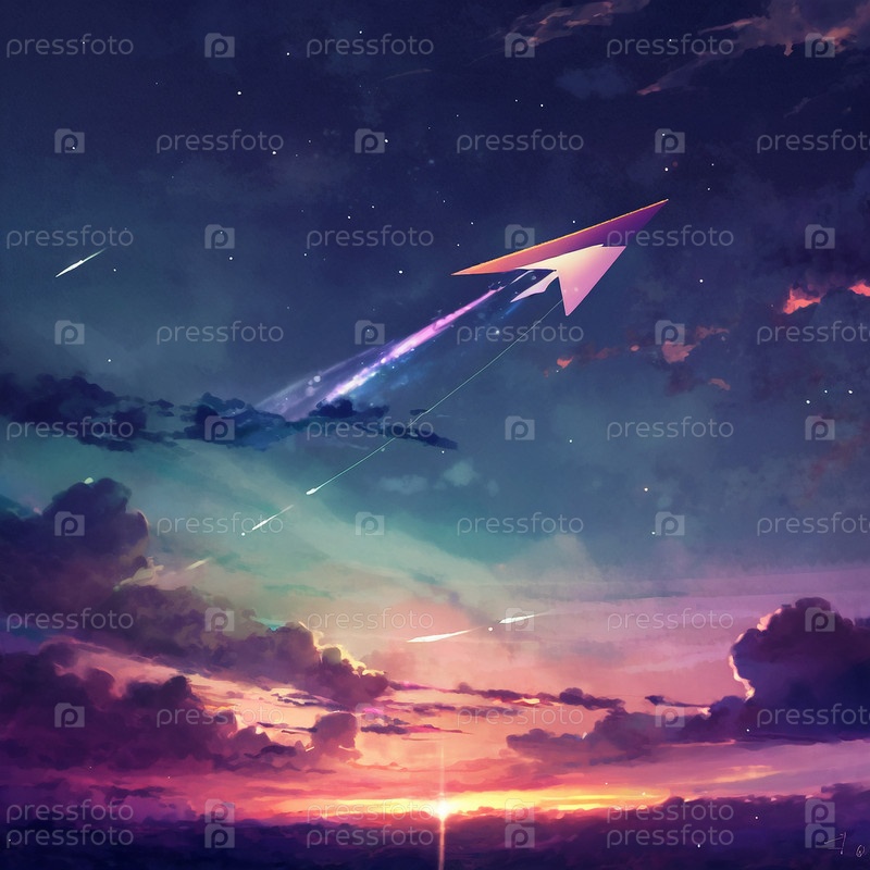 Бумажный самолетик в небе в стиле аниме
