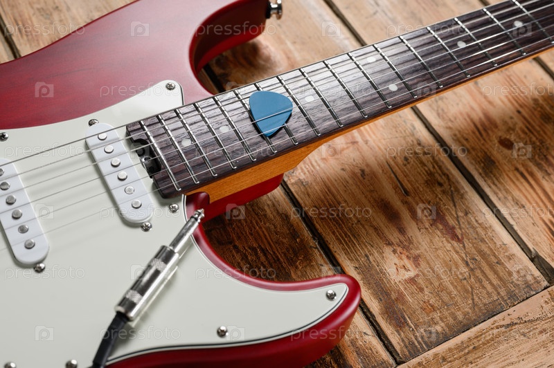 Крупный план электрогитары и плектра на деревянном фоне. Музыкальный инструмент для учебы или работы. Избирательный фокус на посреднике