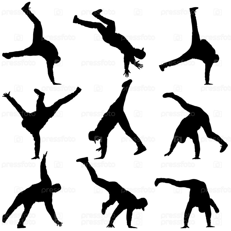Черный набор силуэтов брейкдансера на белом фоне