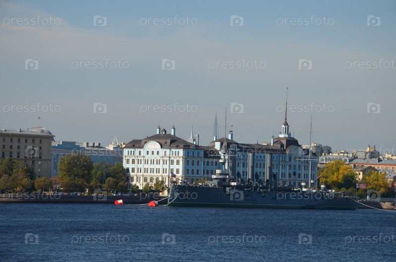 Вид на Крейсер Аврору и Нахимовское училище на Петроградской набережной в Санкт-Петербурге