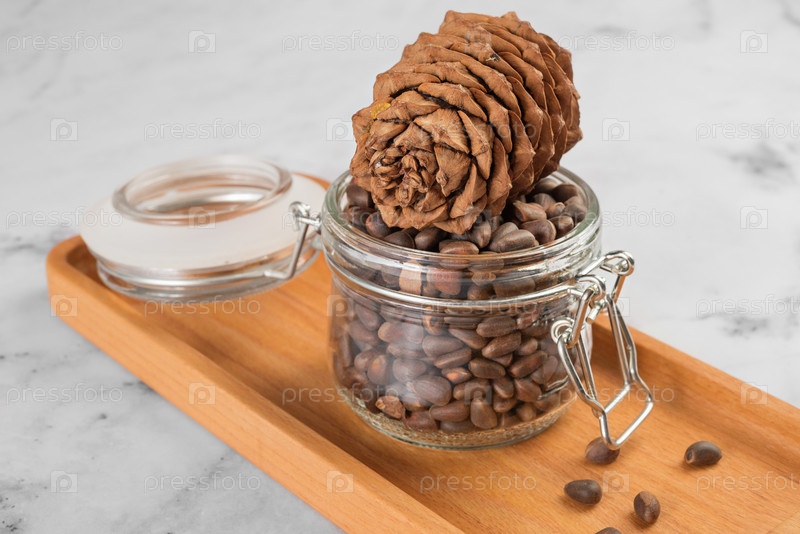 Кедровые орехи в банке и шишка на кухне на светлом фоне