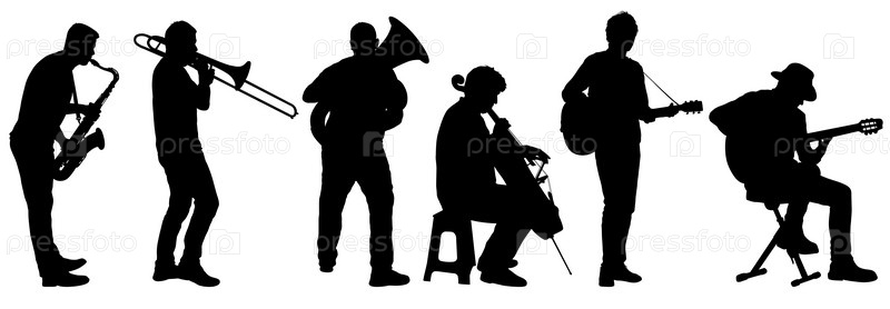 Силуэты уличных музыкантов, играющих на инструментах на белом фоне