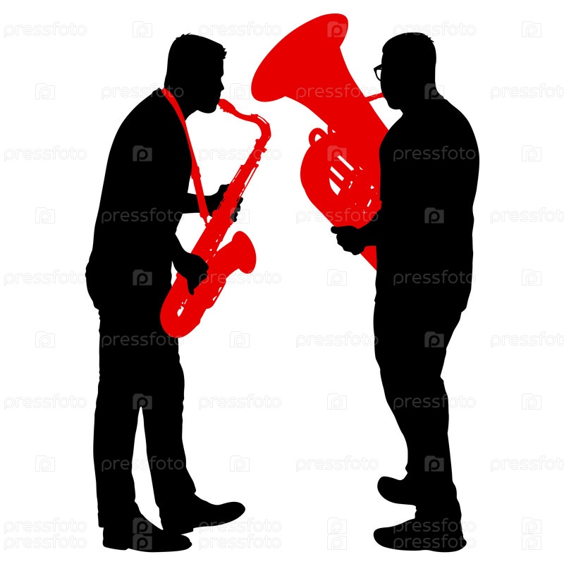 Силуэт музыканта, играющего на саксофоне и тубе на белом фоне