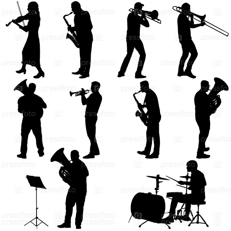 Установите силуэт музыканта, играющего на тромбоне, барабанщике, тубе, трубе, саксофоне, на белом фоне