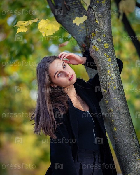 Красивая девушка стоит у дерева в осеннем парке