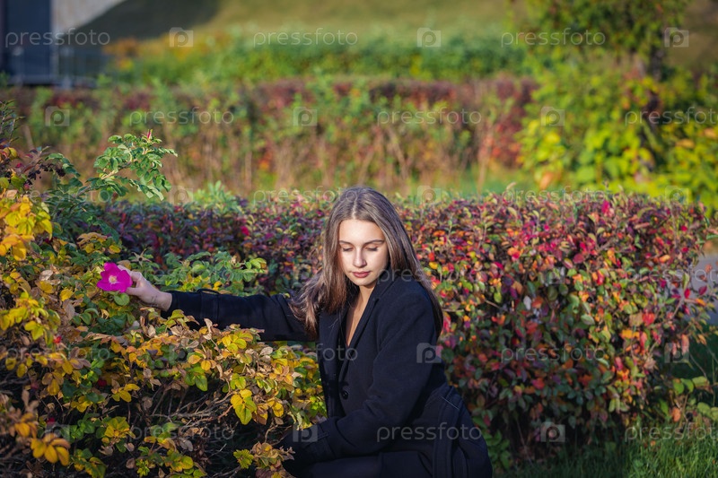 Портрет красивой девушки возле красно-желтого куста в осеннем парке