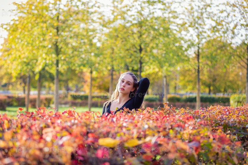 Портрет красивой девушки возле красно-желтого куста в осеннем парке