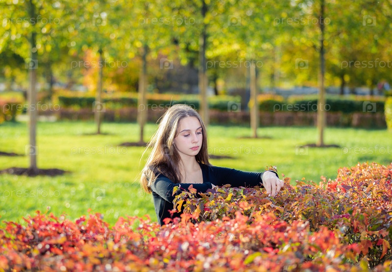 Портрет красивой девушки возле красно-желтого куста в осеннем парке