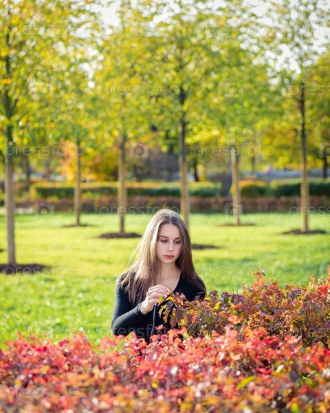 Портрет красивой девушки возле красно-желтого куста в осеннем парке