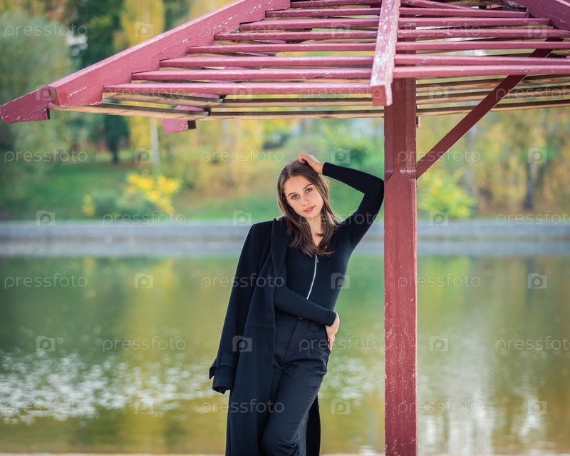 Красивая девушка позирует, стоя у пруда под зонтиком в осеннем парке