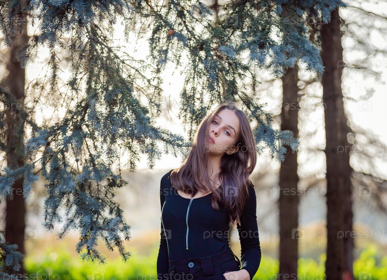 Девушка стоит возле голубой ели в осеннем парке