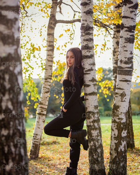 Красивая девушка позирует возле березы в осеннем парке