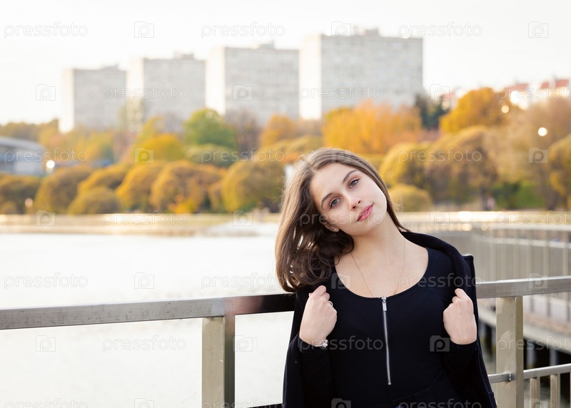 Портрет девушки на мосту возле пруда в городском парке