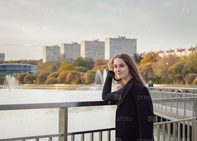 Портрет девушки на мосту возле пруда в городском парке