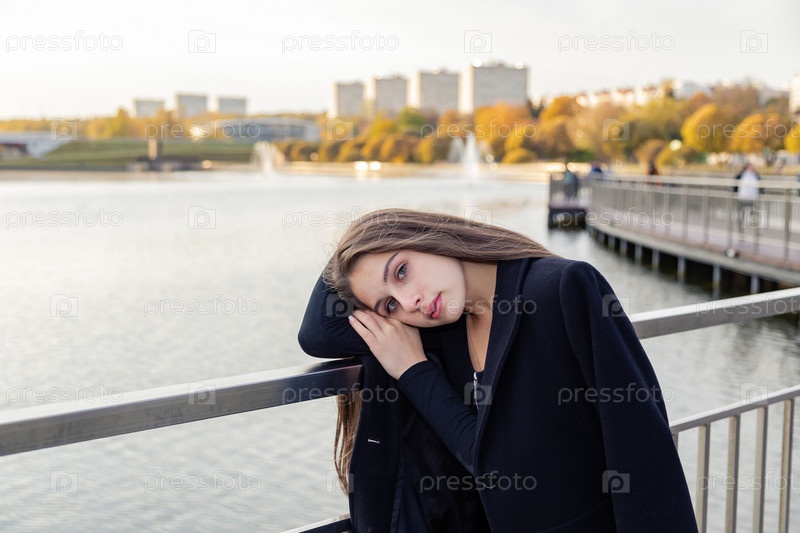 Портрет девушки на мосту возле пруда в городском парке на фоне фонтанов