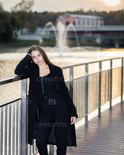 Портрет девушки на мосту возле пруда в городском парке на фоне фонтанов