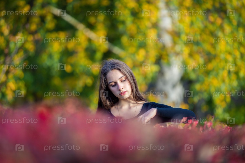 Портрет красивой девушки возле красно-желтого куста в осеннем парке