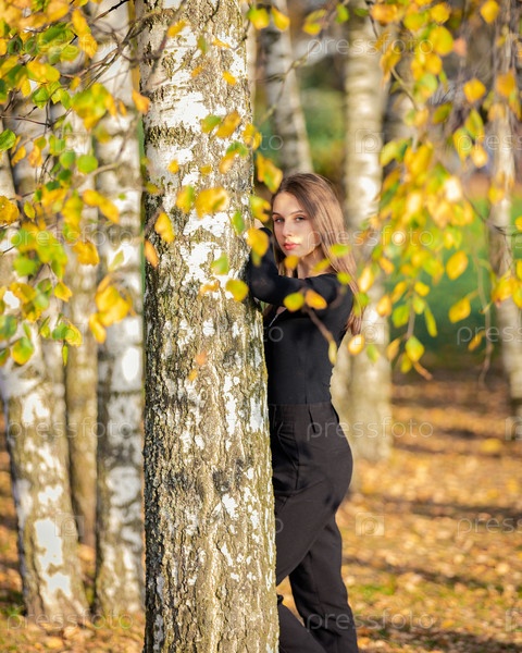 Красивая девушка позирует возле березы в осеннем парке