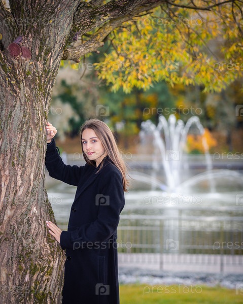 Портрет девушки возле дерева в городском парке на фоне фонтанов