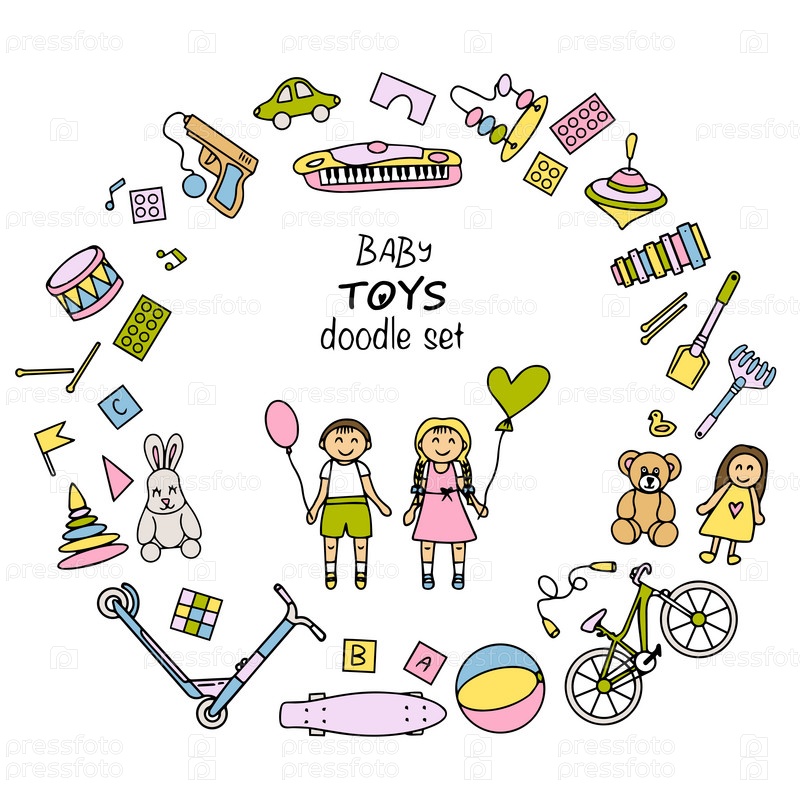 Набор детских игрушек. Яркие игрушки в стиле каракулей. Векторная иллюстрация