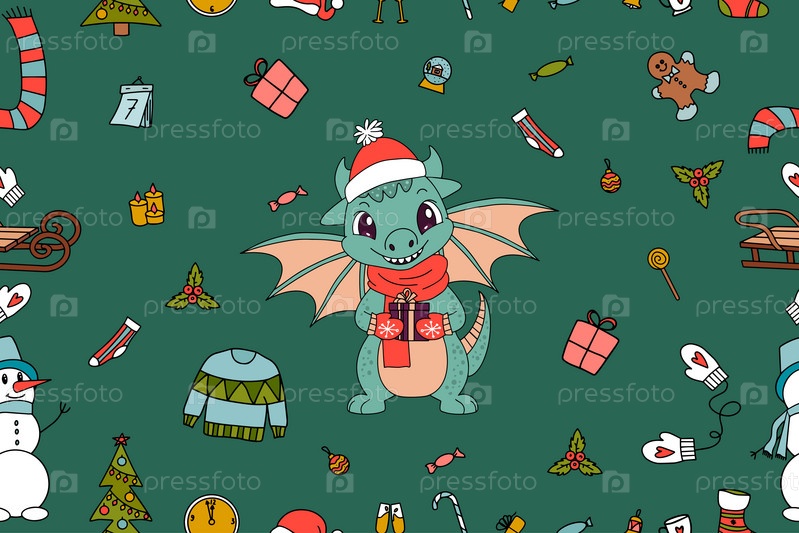 Бесшовный узор из новогодних элементов и милый символ дракона 2024 года. Векторная иллюстрация. Векторная иллюстрация