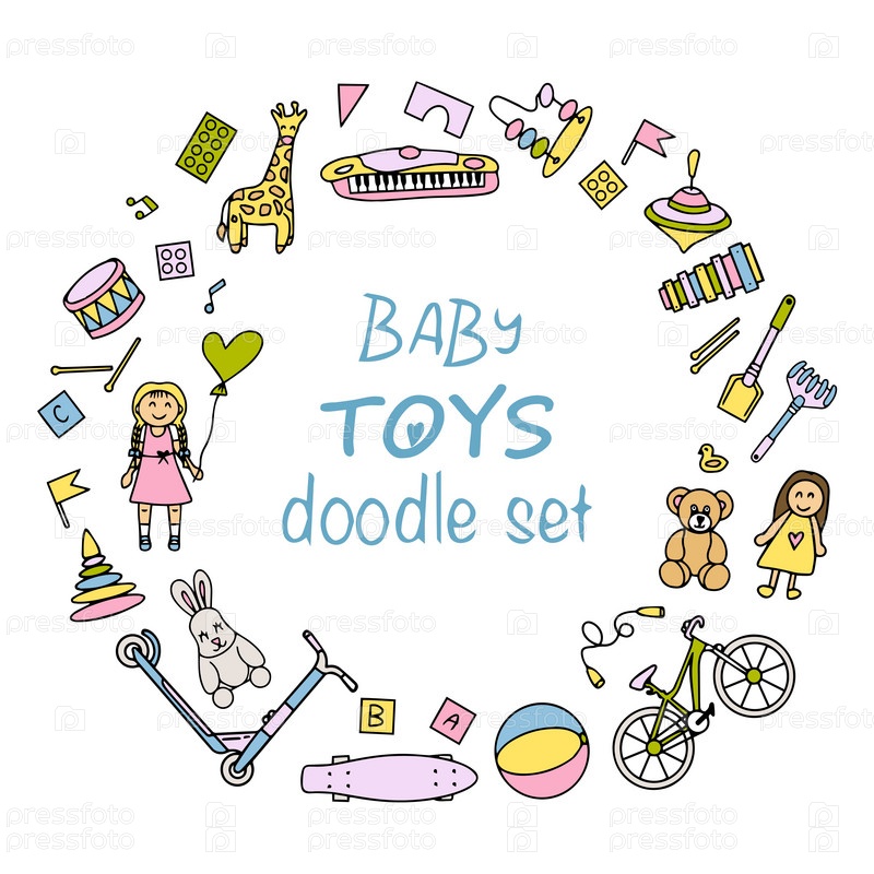 Набор детских игрушек. Яркие игрушки в стиле каракулей. Векторная иллюстрация