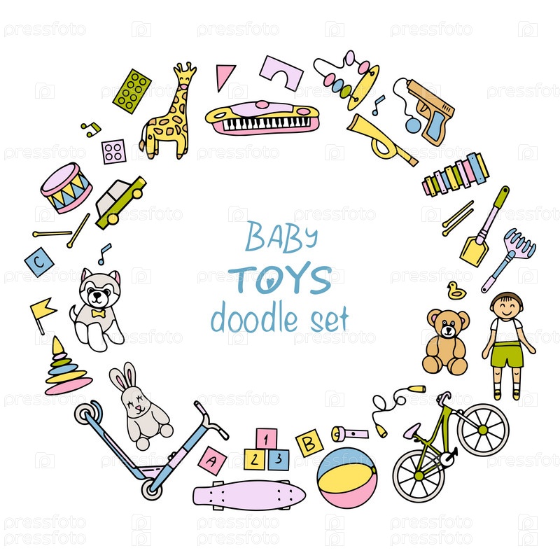 Набор детских игрушек. Яркие игрушки в стиле каракулей. Векторная иллюстрация