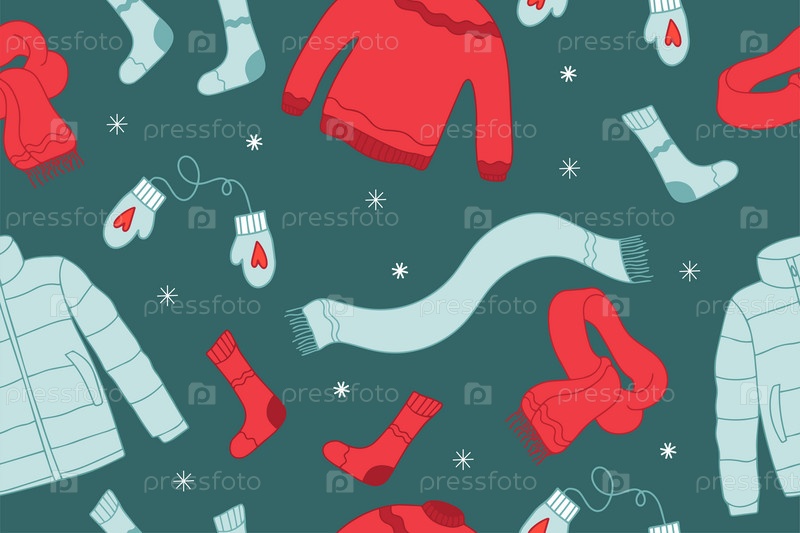 Бесшовный узор с теплыми элементами. Шарф, шапка, варежка. Ручной рисунок. Векторная иллюстрация