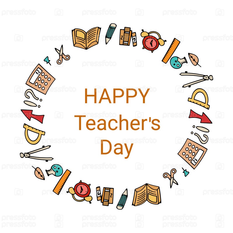 Векторная открытка с Днем учителя с надписями. Дизайн поздравительной открытки, макета, логотипа, марки или баннера ко Дню учителя. Ручные школьные принадлежности и листья