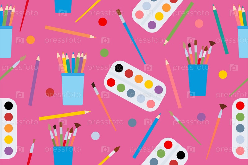Бесшовный узор с художественными принадлежностями на розовом фоне. Вектор