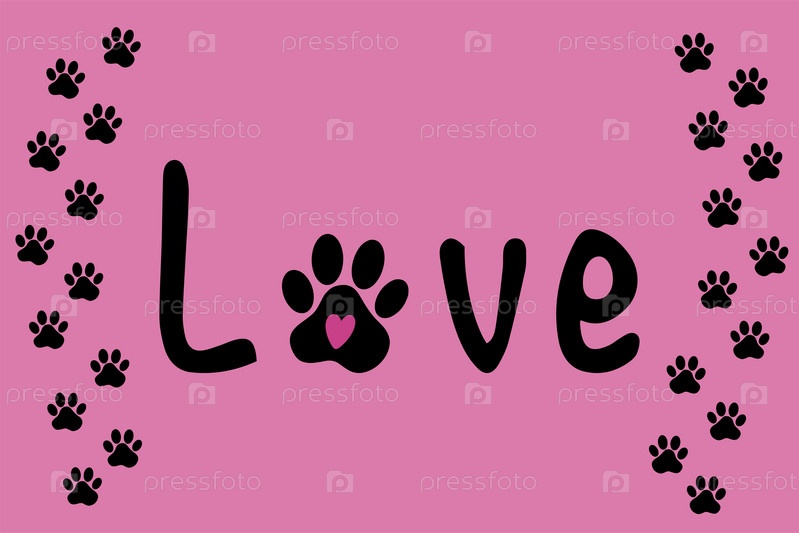 Надпись любовь и отпечаток лапы животного. Векторная иллюстрация изолирована на розовом фоне