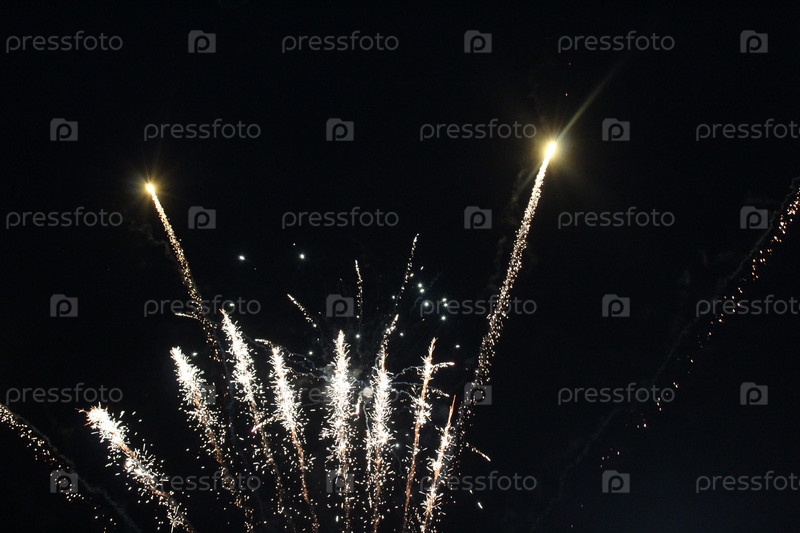 Фейерверк салютует белым на темном черном фоне. Канун Нового года, Рождество, День независимости
