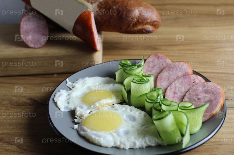 Завтрак традиционная яичница-болтунья, яичница, две ветчинные сосиски и салат из огурцов на серой тарелке на столе. рядом — продукты для приготовления колбасного хлеба на завтрак. Горизонтальное фото