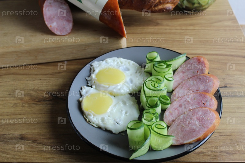Завтрак традиционная яичница-болтунья, яичница, две ветчинные сосиски и салат из огурцов на серой тарелке на столе. рядом — продукты для приготовления колбасного хлеба на завтрак. Горизонтальное фото
