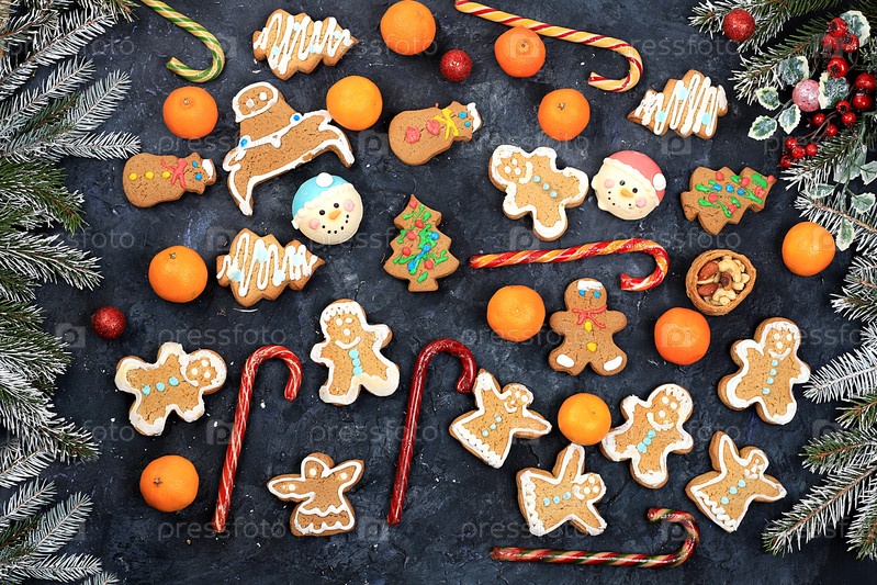 Рождественский новогодний фон, традиционные праздничные пряники и мандарины с еловыми ветками, шишками и украшениями, идея дизайна блюда, концепция выпечки,