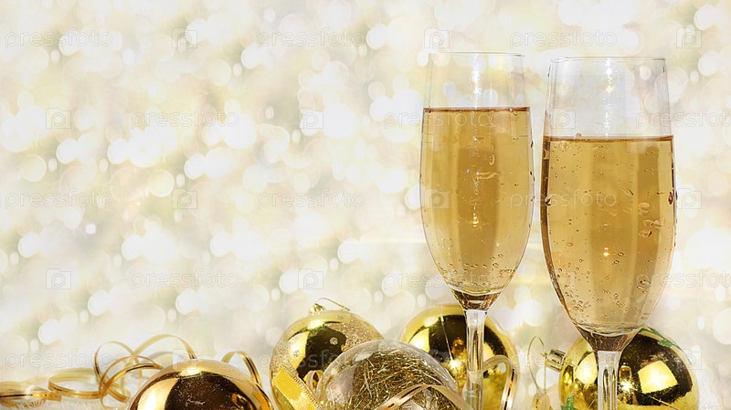 Рождественский и новогодний фон с шампанским, с венком из еловых веток, украшенный праздничными украшениями, место для текста. Праздничная открытка, баннер на экране, настройка продукта для праздничной рекламы, выборочный фокус,